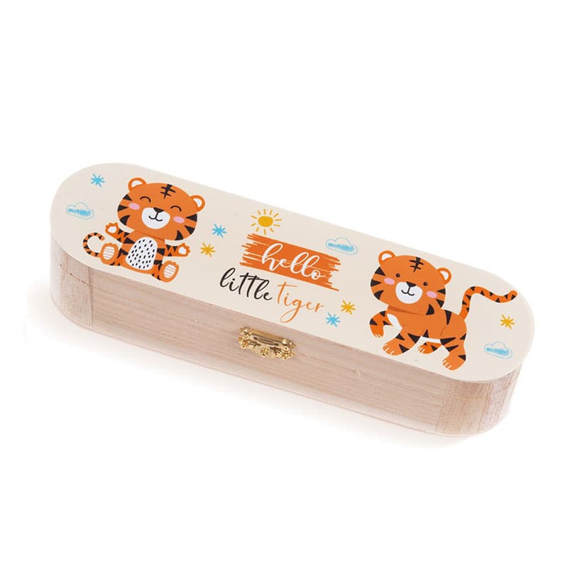 Ξύλινη natural κασετίνα με μεταλλικό κούμπωμα. Είναι διακοσμημένη με αυτοκόλλητο print Τίγρης.
