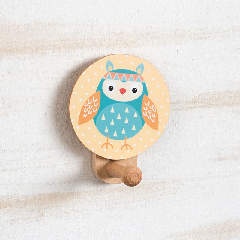 Ξύλινη natural κρεμάστρα τοίχου, διακοσμημένη με στρογγυλό κοπτικό Κουκουβάγια.