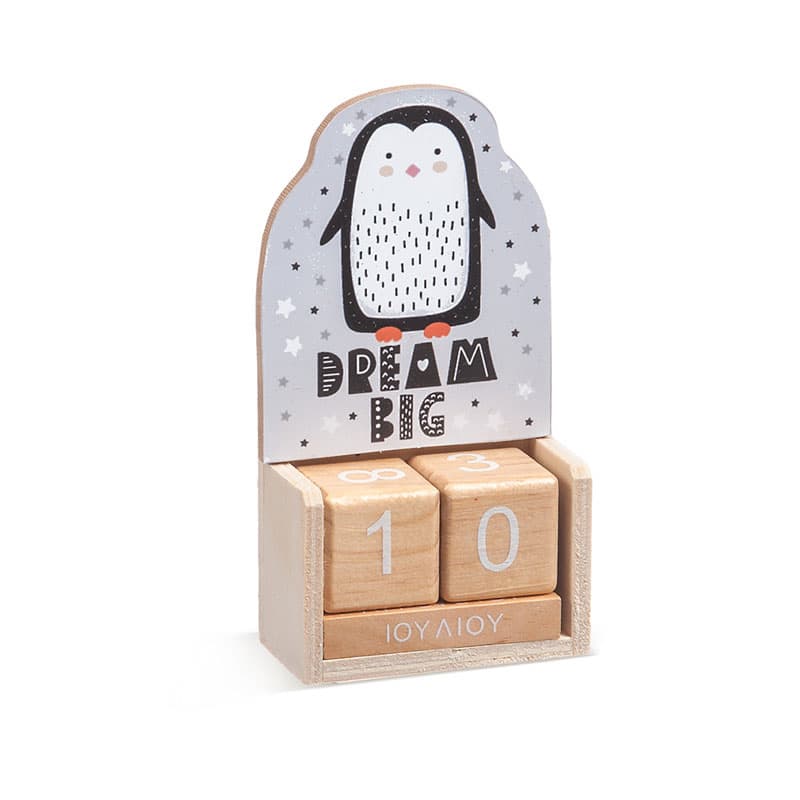 Ξύλινο ημερολόγιο με κύβους σε natural χρώμα. Διακοσμημένο με κοπτικό Πιγκουίνος.