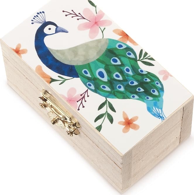 Ξύλινο natural σεντούκι με μεταλλικό κούμπωμα. Είναι διακοσμημένο με αυτοκόλλητο print παγώνι.