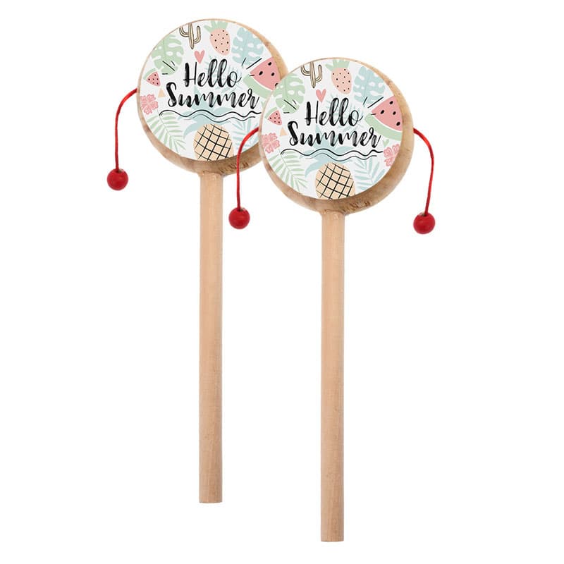 Ξύλινο natural τυμπανάκι με αυτοκόλλητο print Hello Summer με διαφορετικό σχέδιο μπρος-πίσω.
