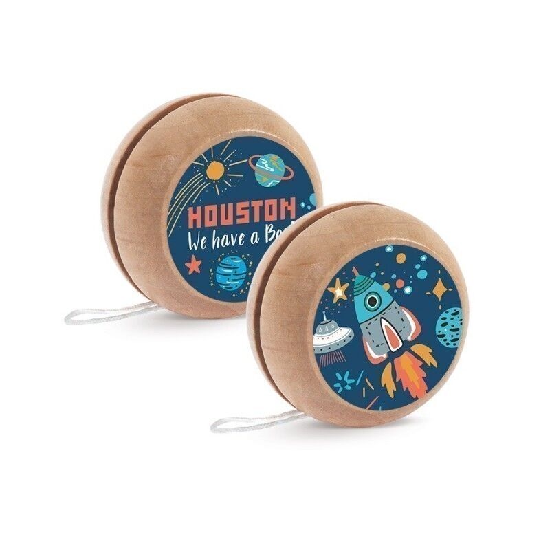 Ξύλινο natural γιο-γιο με σκοινάκι. Είναι διακοσμημένο με αυτοκόλλητο print Διάστημα με διαφορετικό σχέδιο μπρος-πίσω.