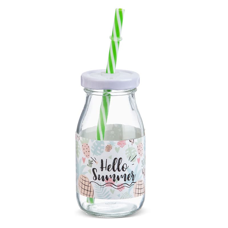Γυάλινο μπουκάλι γάλακτος 200ml με λευκό μεταλλικό καπάκι. Συνοδεύεται από πολύχρωμα καλαμάκια. Είναι διακοσμημένο με αυτοκόλλητο print Hello Summer.