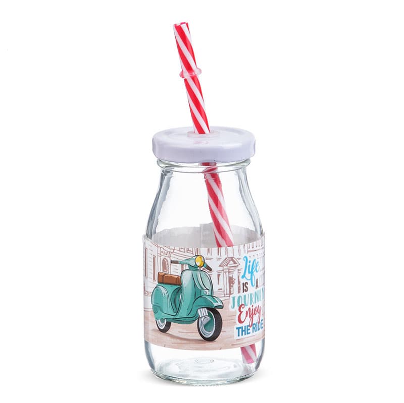 Γυάλινο μπουκάλι γάλακτος 200ml με λευκό μεταλλικό καπάκι. Συνοδεύεται από πολύχρωμα καλαμάκια. Είναι διακοσμημένο με αυτοκόλλητο print Βέσπα.