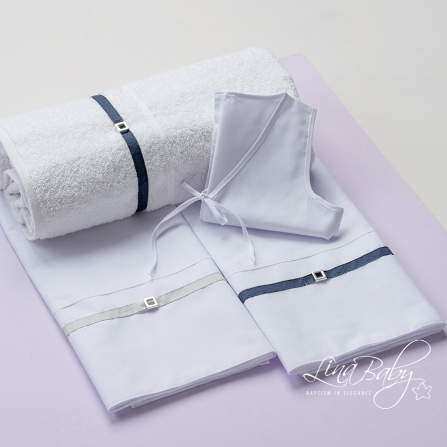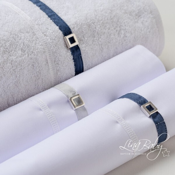 Βαμβακερό σετ λαδόπανων σε Λευκό χρώμα με διακοσμητικές τρέσες στις αποχρώσεις του λευκού & μπλε Navy. Ασημένιο διακοσμητικό "τετράγωνο" περασμένο στην τρέσα, δίνει μια αίσθηση πολυτέλειας.
