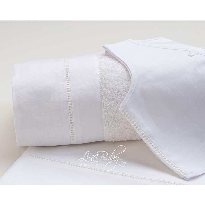 Το Ελληνικό νησί είναι συνώνυμο του καλοκαιριού. Ολοβάμβακο σετ λαδόπανου σε Λευκό χρώμα με φαρδυά διακοσμητική λινή φάσα Ισπανίας και διακριτική δαντέλα φυτιλάκι διάτρητη.