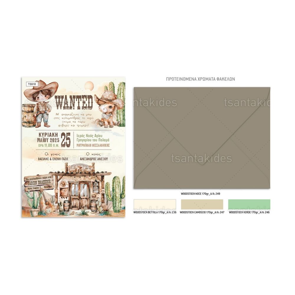 Προσκλητήριο βάπτισης για αγόρι με θέμα Cowboys.