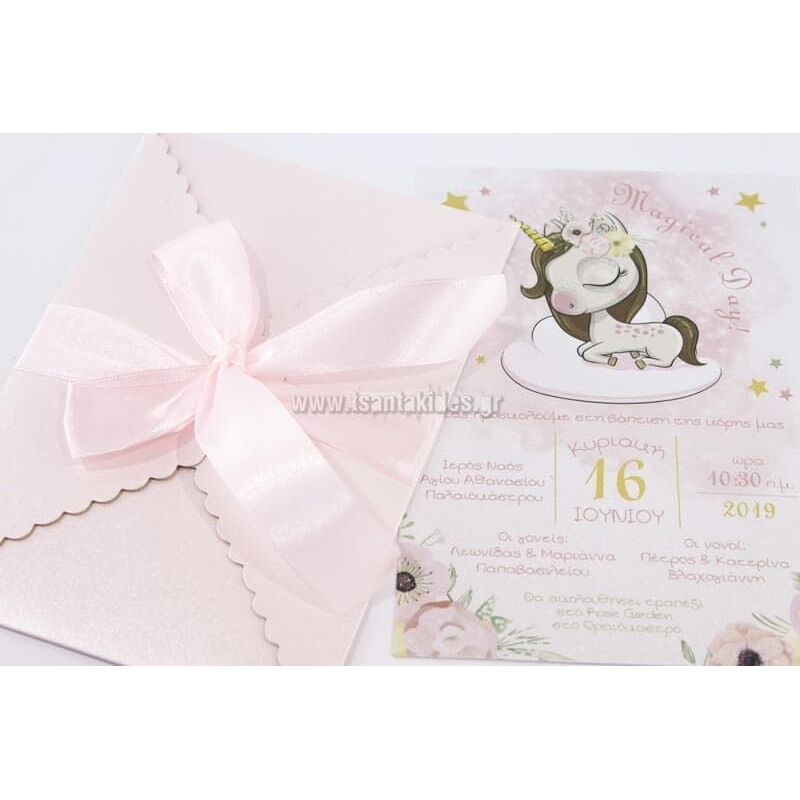Προσκλητήριο βάπτισης για κορίτσι με θέμα το baby unicorn σε ρομαντικές παστέλ αποχρώσεις.