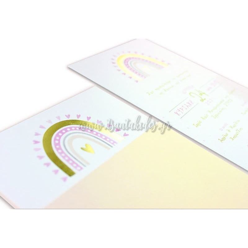 Προσκλητήριο βάπτισης για κορίτσι με θέμα το ουράνιο τόξο σε ροζ παστέλ αποχρώσεις.