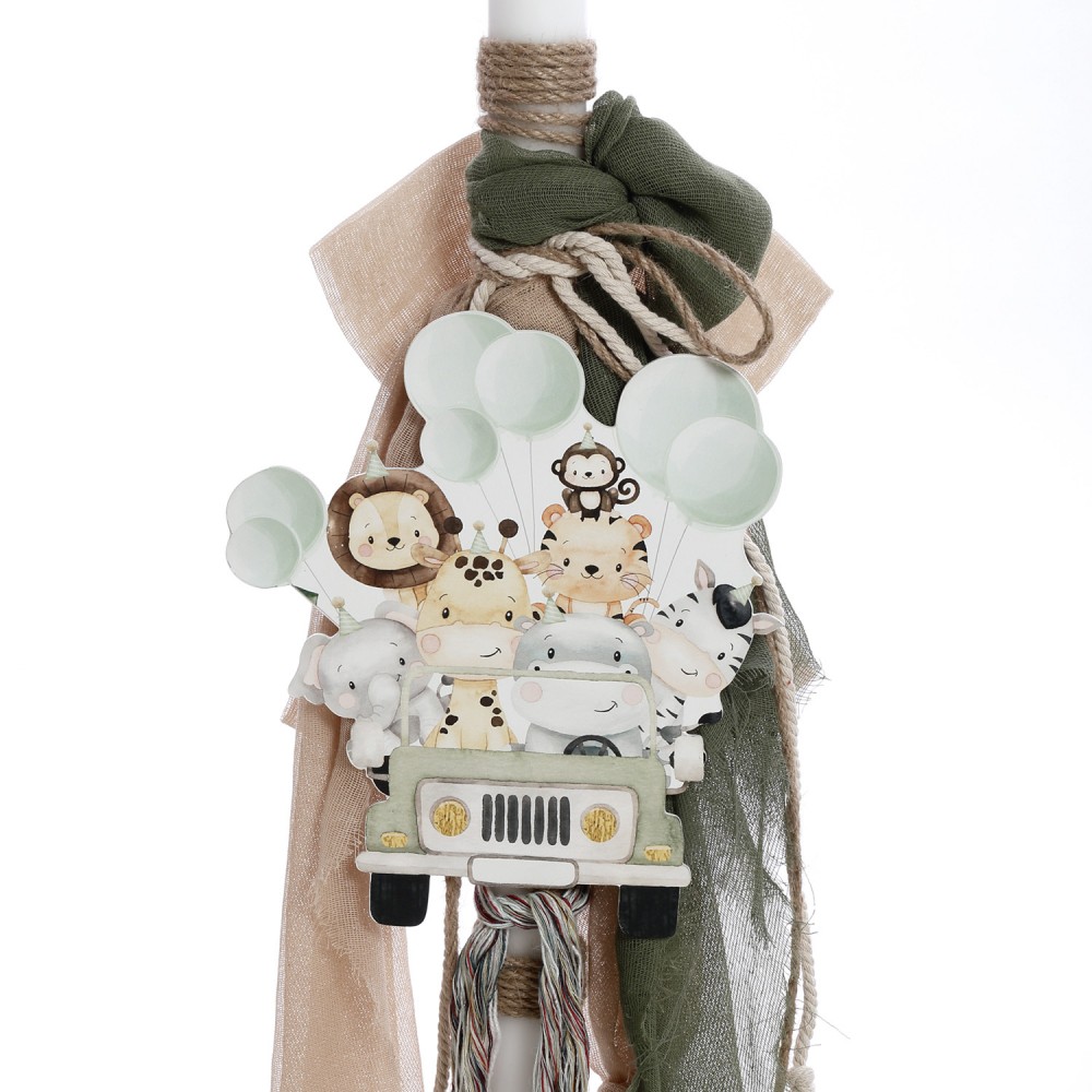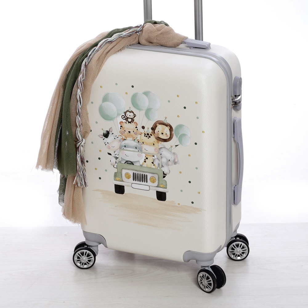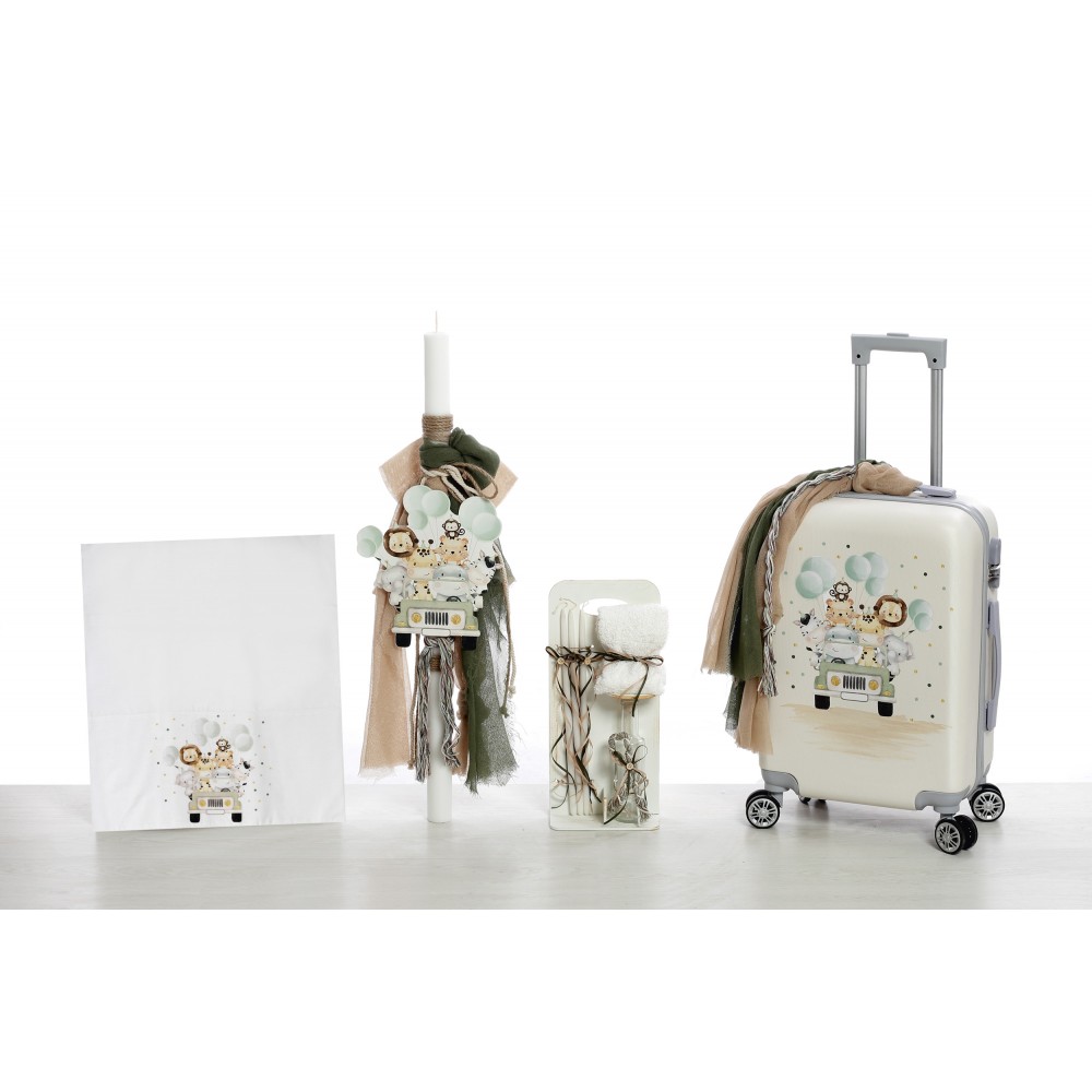 Σετ βάπτισης (Βαλίτσα, λαμπάδα, σταντ λαδιού, λαδόπανα με πετσέτες και τα εσώρουχα) με θέμα Σαφάρι σε εκτυπωμένη βαλίτσα (όχι αυτοκόλλητο)