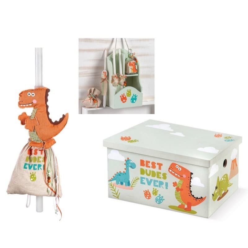 Λαμπάδα βάπτισης,διακοσμημένη με λινή τσάντα πάνω στην οποία είναι ζωγραφισμένη η φράση BEST DUDES EVER. Τη λαμπάδα διακοσμεί επίσης ένας εντυπωσιακός πάνινος δεινόσαυρος ενώ από την τσάντα κρέμονται κορδέλες πορτοκαλί και πράσινες με πολύχρωμες χάντρες.