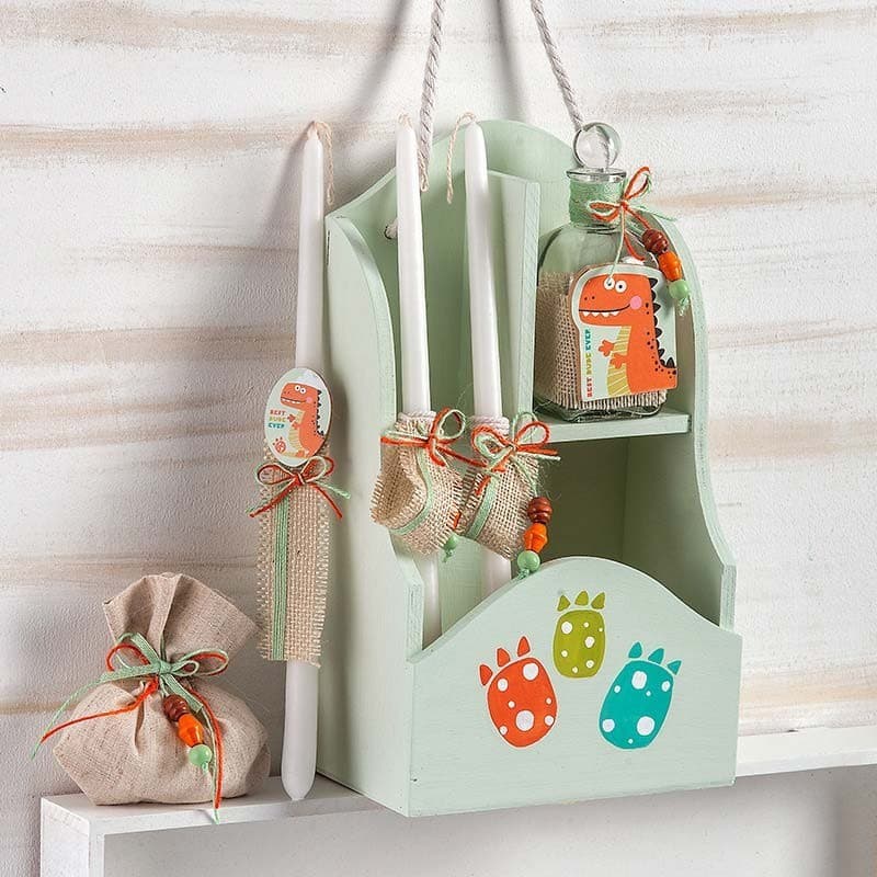 Ξύλινη κρεμαστή συσκευασία βαμμένη σε απόχρωση πράσινη-λαδί που χρησιμεύει ως ράφι λαδικών. Στο μπροστινό μέρος έχει ζωγραφιστά πατουσάκια δεινοσαύρου πορτοκαλί-πράσινα και τιρκουάζ.Ο κωδικός περιλαμβάνει τα 3 κεράκια,το σαπούνι μέσα σε πουγκάκι και το μπουκάλι του λαδιού,όλα στολισμένα σε φυσικές-πορτοκαλί-πράσινες αποχρώσεις με κορδέλες.