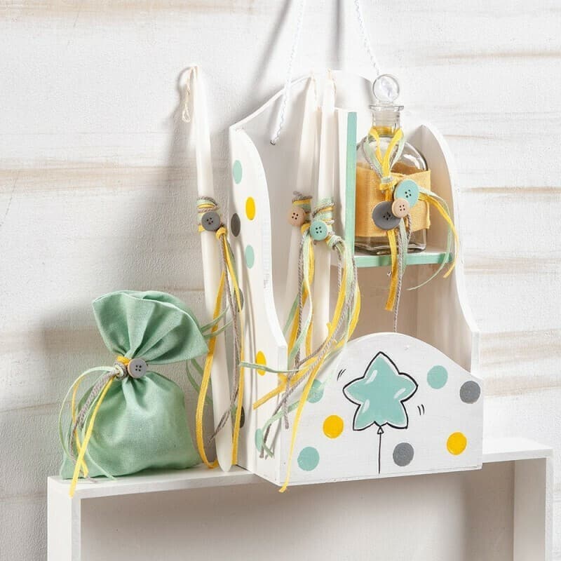 Ξύλινη κρεμαστή συσκευασία σε λευκό χρώμα ζωγραφισμένη με αστέρι και πουά κίτρινα,βεραμάν και γκρι. Η συσκευασία περιλαμβάνει στολισμένα 3 κεριά,σαπούνι μέσα σε πουγκάκι και μπουκάλι λαδιού.
