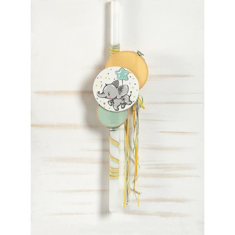 Λαμπάδα βάπτισης με θέμα το baby ελεφαντάκι που χαρούμενο πετά. Είναι τυλιγμένη με κορδόνια γιούτα σε κίτρινες,βεραμάν και γκρι αποχρώσεις. Το καδράκι στο μπροστινό μέρος είναι τοποθετημένο σε δυο πλαίσια που δίνουν την αίσθηση μπαλονιού.