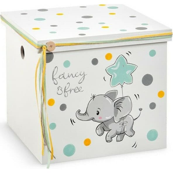 Ξύλινος κουτί βαπτιστικών κύβος λευκός με πουά κίτρινα, βεραμάν και γκρι. Στο μπροστινό κομμάτι είναι ζωγραφισμένο ένα baby ελεφαντάκι γκρι με μπαλόνι σε σχήμα αστεριού. Το μικρό ελεφαντάκι που ελεύθερα πετά!