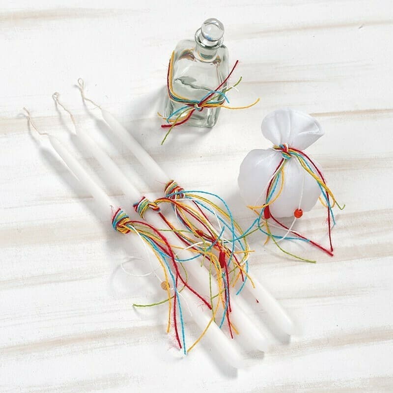 Σετ λαδιού στολισμένο με πολύχρωμα κορδόνια.Ο κωδικός περιλαμβάνει το μπουκάλι του λαδιού,το σαπούνι μέσα σε πουγκάκι και τα 3 κεράκια,όλα στολισμένα σε πολύχρωμες αποχρώσεις
