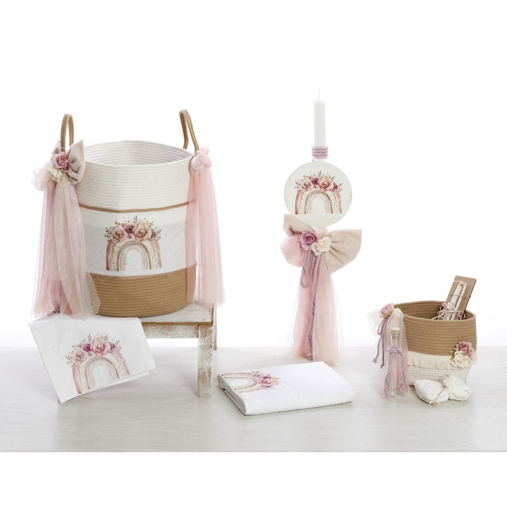 Ολοκληρωμένο βαπτιστικό σετ με θέμα το Ουράνιο Τόξο, διακοσμημένο με υψηλής ποιότητας UV εκτύπωση και ρομαντικά στοιχεία σε παστέλ αποχρώσεις του ροζ και του μπεζ. Ιδανικό για μια παραμυθένια και κομψή βάπτιση.