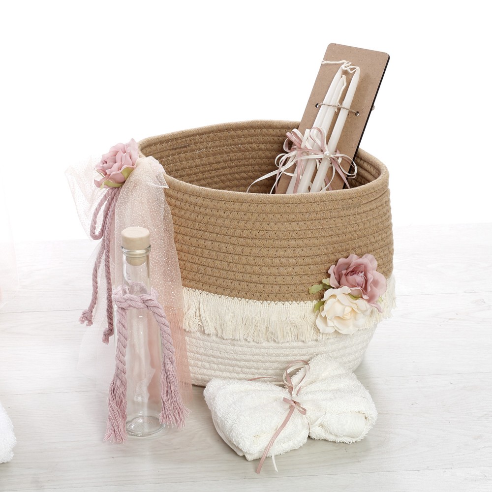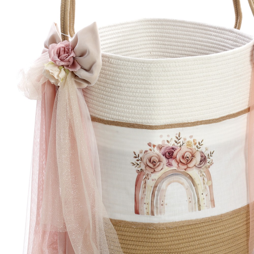 - Πλεκτό καλάθι βάπτισης διακοσμημένο με UV εκτύπωση ουράνιου τόξου, υφασμάτινα λουλούδια, κορδέλες και τούλια. (Διαστάσεις: 50cm x 40cm x 40cm)