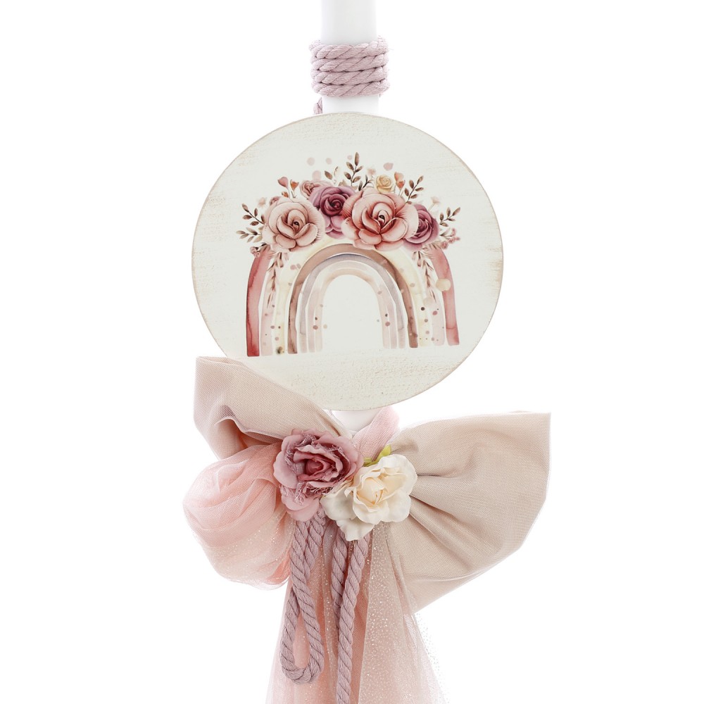 - Λαμπάδα βάπτισης, διακοσμημένη με ξύλινο διακοσμητικό στοιχείο UV εκτύπωσης ουράνιου τόξου, φιόγκους, δαντέλα και υφασμάτινα λουλούδια.
