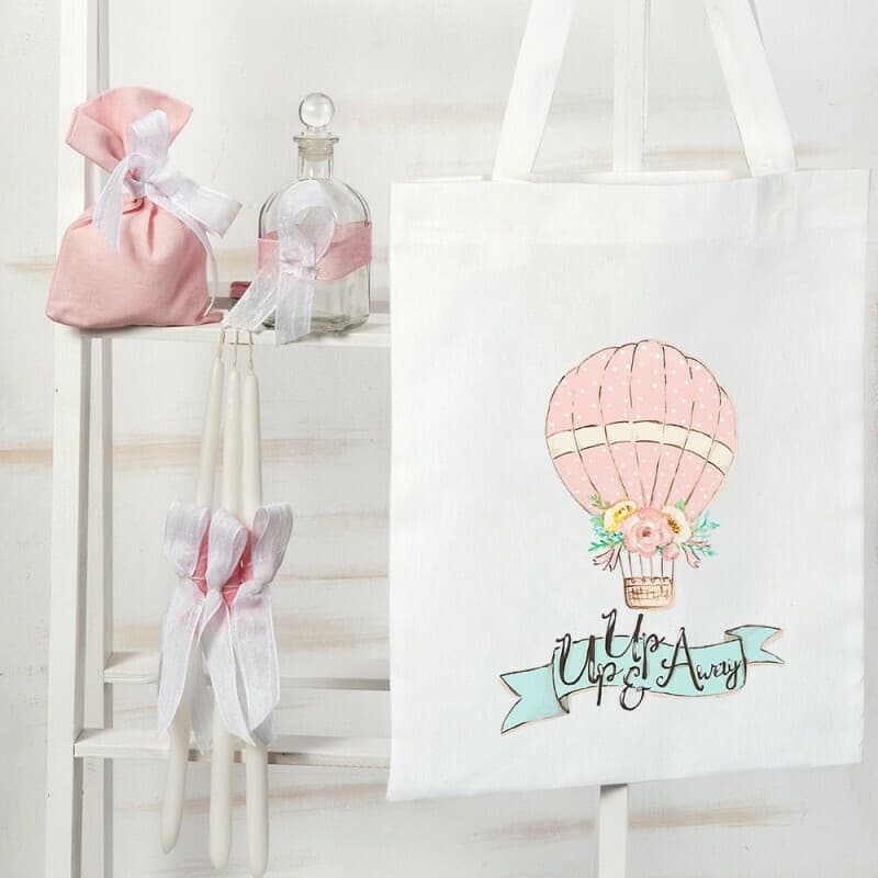 Ζωγραφιστή υφασμάτινη τσάντα με 3 κεριά,σαπούνι και μπουκάλι λαδιού στολισμένα σε ροζ, λευκές αποχρώσεις. Η τσάντα είναι ζωγραφιστή στο μπροστινό κομμάτι με ένα πουά ροζ αερόστατο που ταξιδεύει στους αιθέρες.