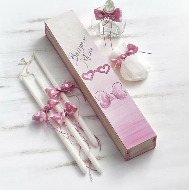 Disney κουτί συσκευασίας παραλληλόγραμμο ροζ με θέμα τη γατούλα Marie και ζωγραφισμένη τη φράση Bonjour Marie πάνω . Ο κωδικός περιλαμβάνει τα 3 κεράκια, το σαπούνι μέσα σε πουγκάκι και το μπουκάλι του λαδιού, όλα στολισμένα σε ροζ αποχρώσεις