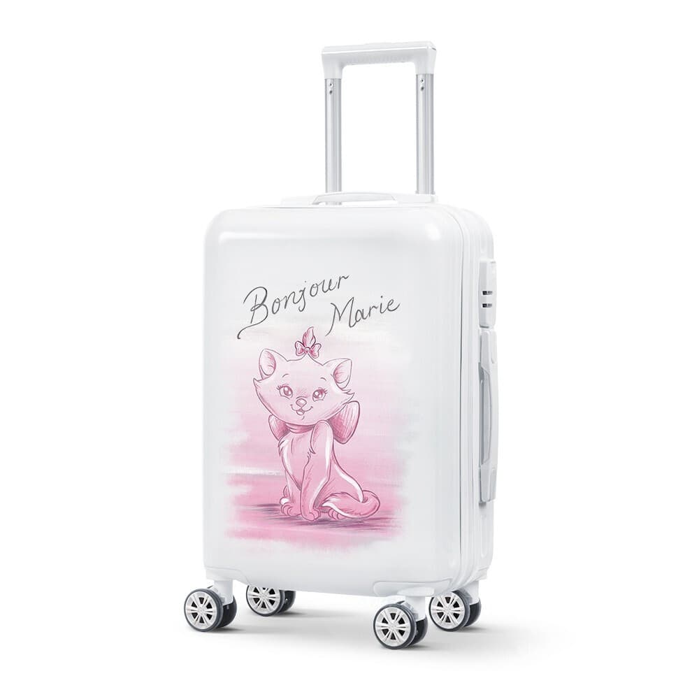 Disney ζωγραφιστή βαλίτσα trolley για βαπτιστικά σε άσπρο γυαλιστερό χρώμα. Είναι ζωγραφισμένη στο χέρι με τη γατούλα Marie από τις Αριστόγατες και τη φράση Bonjour Marie. Κυριαρχεί το ροζ χρώμα.