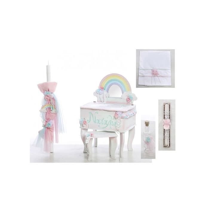 Χειροποίητο σετ βάπτισης μπουντουάρ με θέμα Ουράνιο Τόξο ζωγραφισμένο στο χέρι