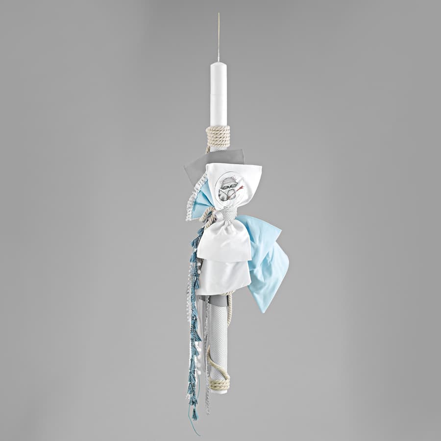 Λαμπάδα βάπτισης σε απόχρωση γκρι-γαλάζιο. Η διακόσμηση ολοκληρώνεται με διακοσμητικό ρακούν.