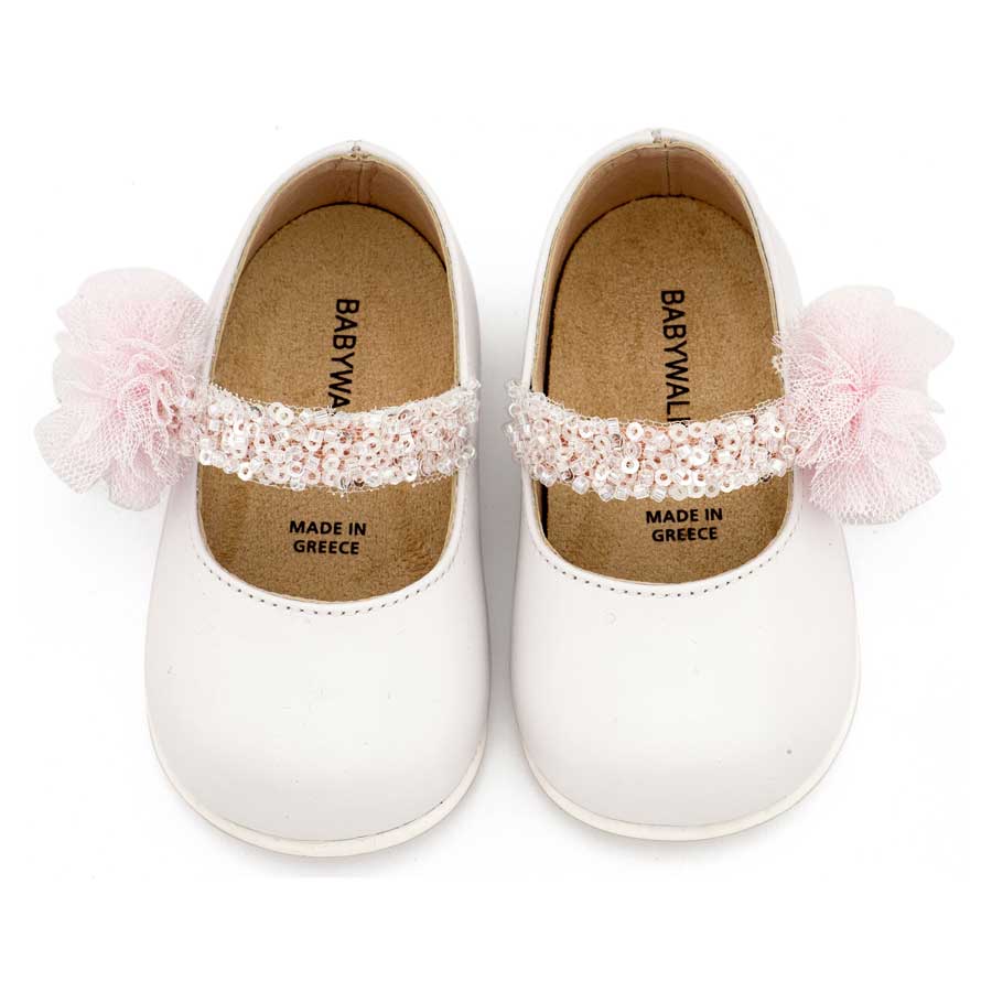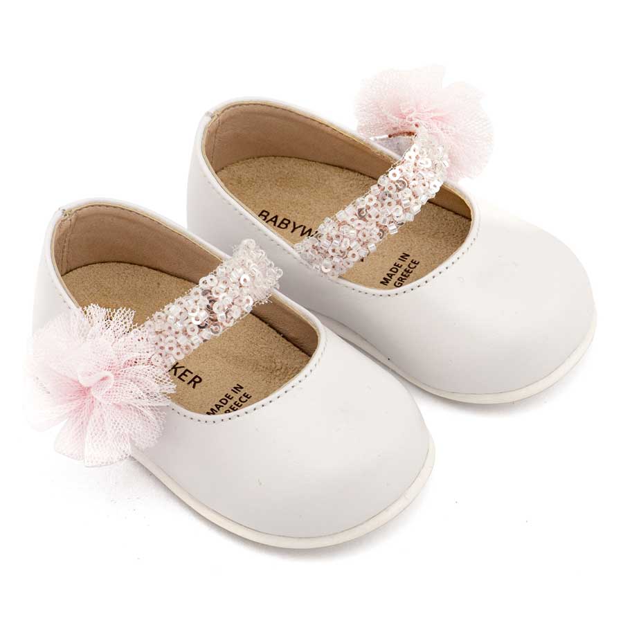 Babywalker Γοβάκι Μονή Μπαρέτα Διακοσμημένο με Τρέσα και Τούλινο Πον Πον PRI2657 Λευκό Ροζ