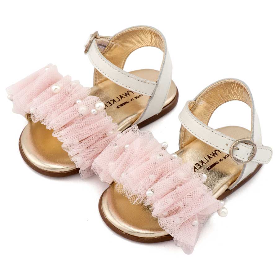 Δερμάτινο Πέδιλο με Χειροποίητο Διακοσμητικό απο Τούλι σε Εκρού Ροζ Χρώμα
