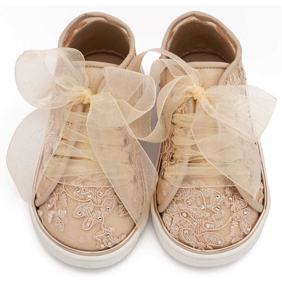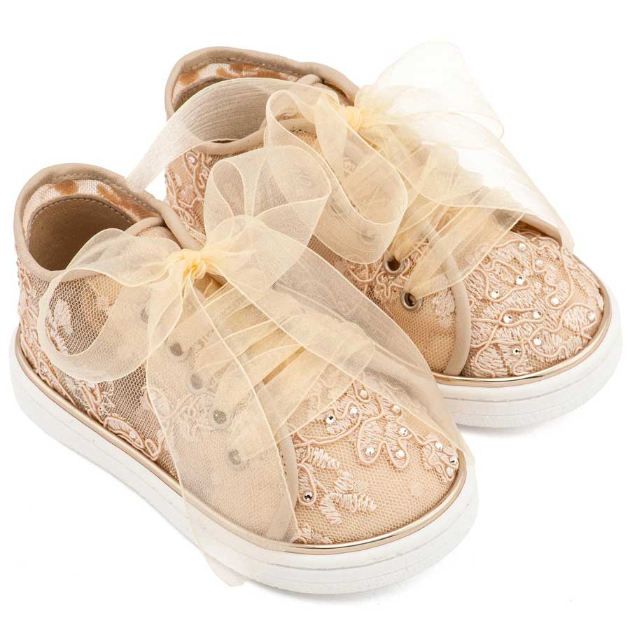 Sneaker απο Ύφασμα Φιλντιρέ Λουλούδια με Δερμάτινες Λεπτομέρειες και Chiffon Κορδόνι σε Μπεζ Χρώμα
