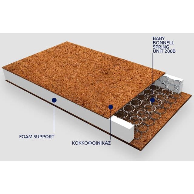 Ο ελαστικοποιημένος κοκκοφοίνικας προέρχεται από τη συλλογή και την επεξεργασία των εξωτερικών ινών της τροπικής καρύδας, οι οποίες εμπλουτίζονται με εκχυλίσματα από το δέντρο καουτσούκ (latex). Ένα 100% φυσικό υλικό με μεγάλη διάρκεια ζωής και σταθερή υπόσταση, που προσφέρει άνεση και ευκαμψία. Επιπλέον, η δομή του ελαστικοποιημένου κοκκοφοίνικα επιτρέπει τη διαπνοή του αέρα στο εσωτερικό των ινών, προσφέροντας έτσι ένα φυσικό μονωτικό περιβάλλον που εξασφαλίζει τη διατήρηση της σωστής θερμοκρασίας και υγρασίας και εμποδίζει την ανάπτυξη μικροβίων, μυκήτων και ακάρεων.