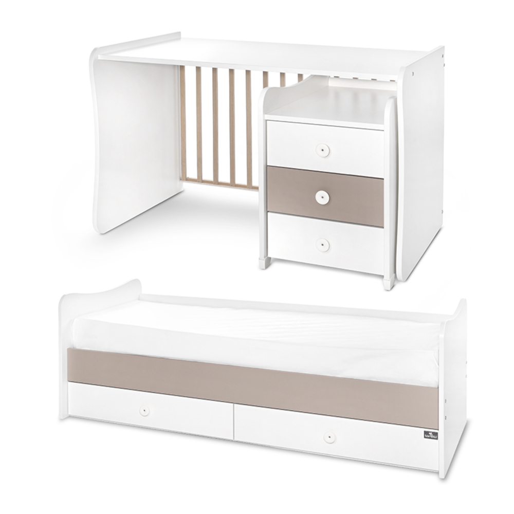 Πολυμορφικό Κρεβάτι-Κούνια μετατρέπεται εύκολα σε εφηβικό κρεβάτι. Διαθέτει 2 ευρύχωρα συρτάρια στο κάτω μέρος, πολυλειτουργική συρταριέρα(σιφονιέρα) – αλλαξιέρα με 3 συρτάρια που τοποθετείται και στις 2 πλευρές του κρεβατιού. Κατά την εφηβική χρήση αποσπάται από το κρεβάτι και λειτουργεί ως ανεξάρτητο έπιπλο. Η κούνια 3 επιπέδων διαθέτει μηχανισμό λικνίσματος με δυνατότητα κλειδώματος και ρυθμιζόμενο κάγκελο με μηχανισμό αυτόματης σταθεροποίησης. Κατά την εφηβική χρήση μετατρέπεται σε γραφείο.