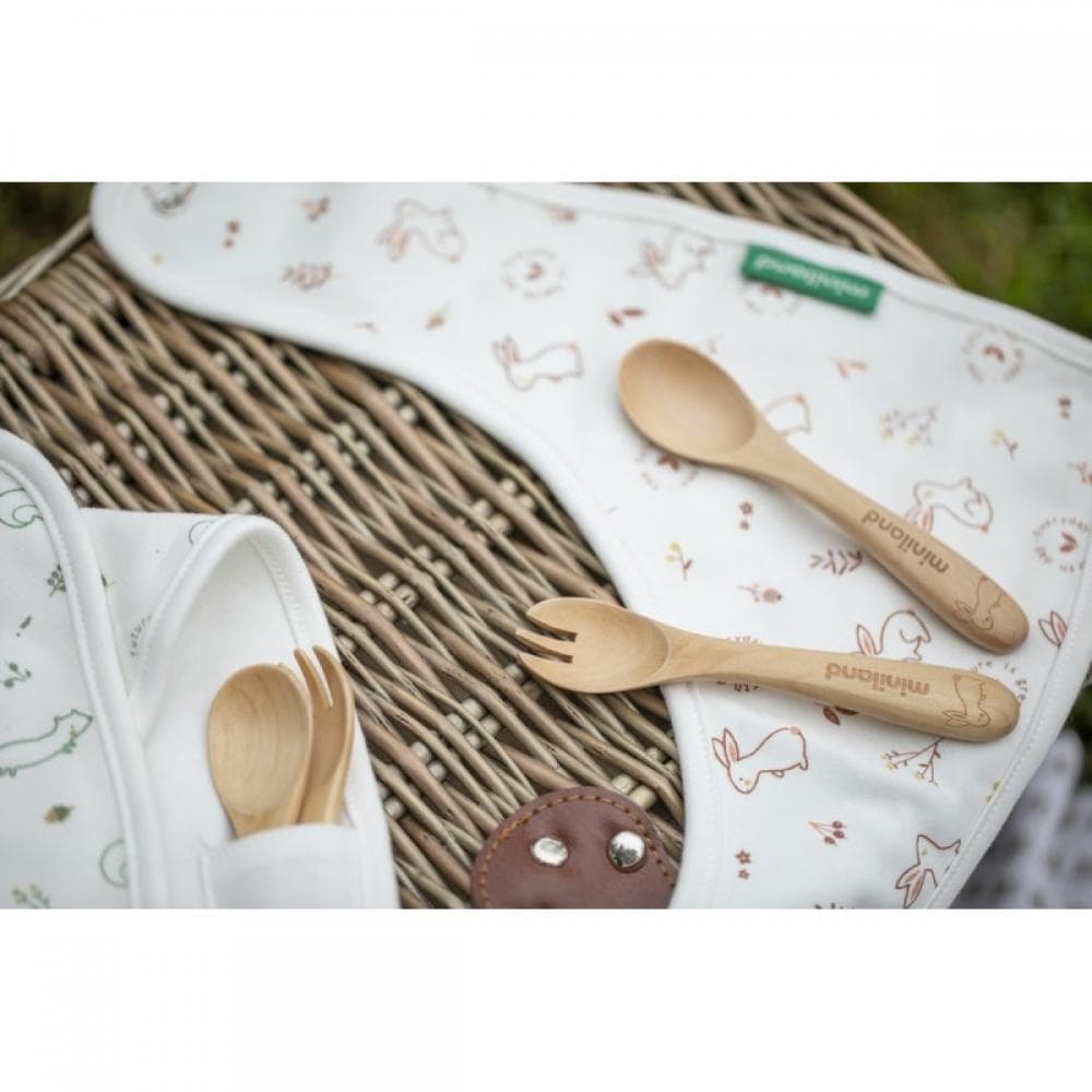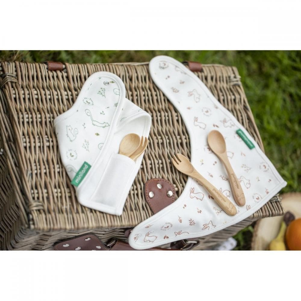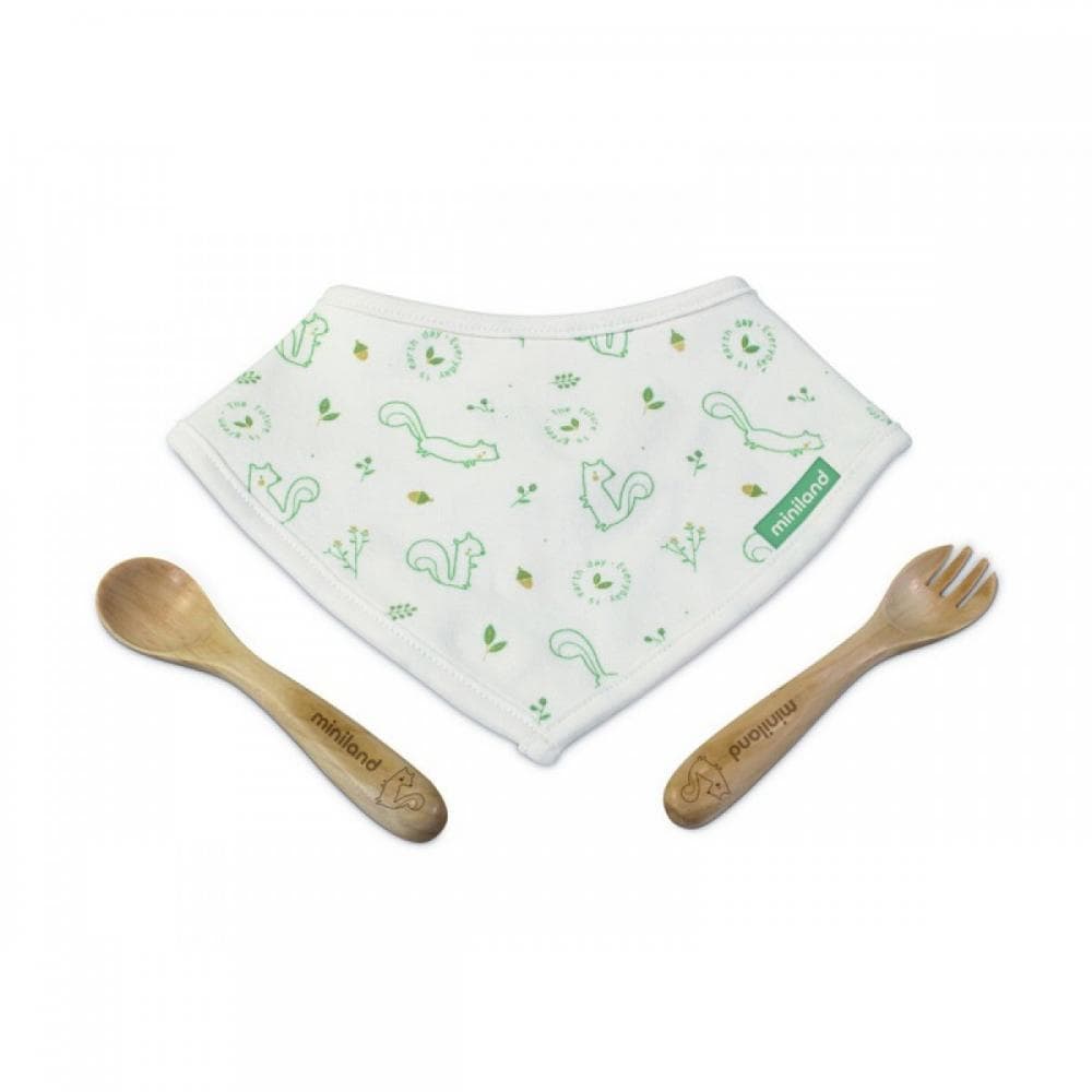 - Αυτό το οικολογικό σετ περιλαμβάνει ένα κουτάλι και ένα πιρούνι από φυσικό ξύλο και μια βαμβακερή πετσέτα για να τα τυλίγει.