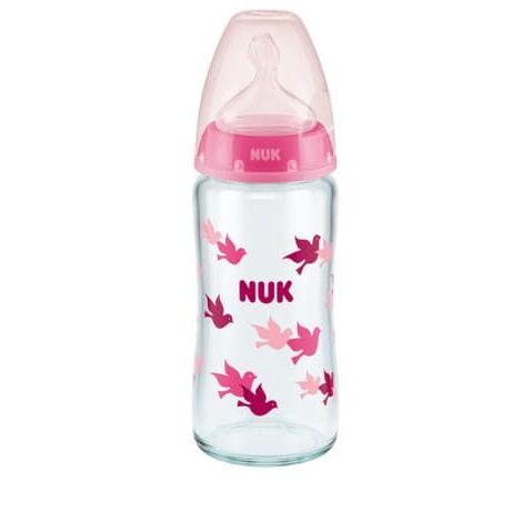 Nuk First Choice+ Γυάλινο Μπιμπερό με Δείκτη Ελέγχου Θερμοκρασίας με Θηλή Σιλικόνης 0-6m 240ml Pink Birds 10745124