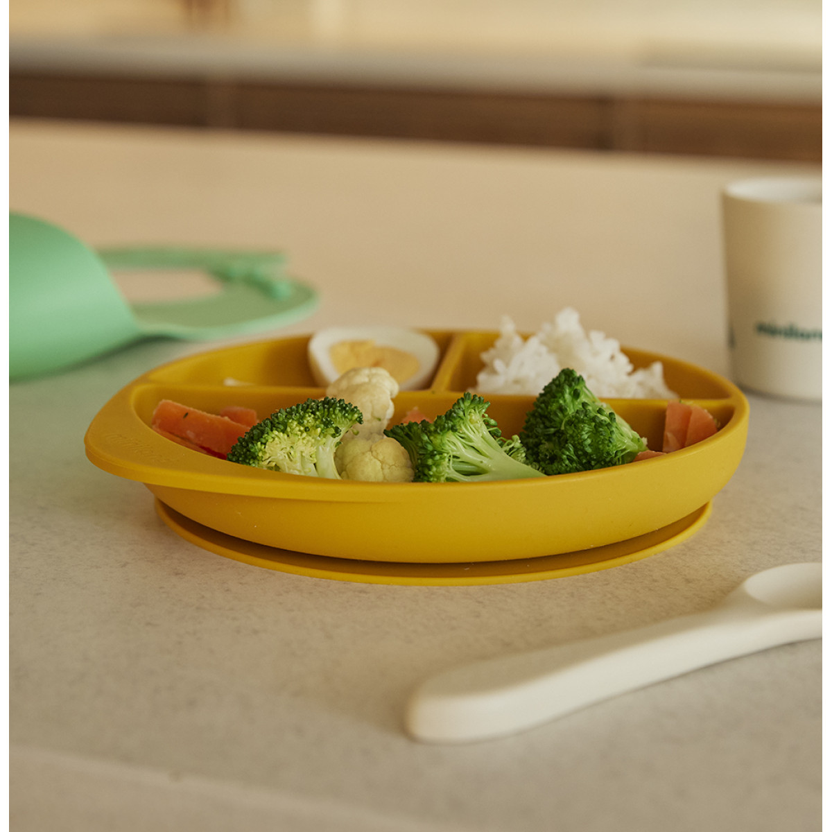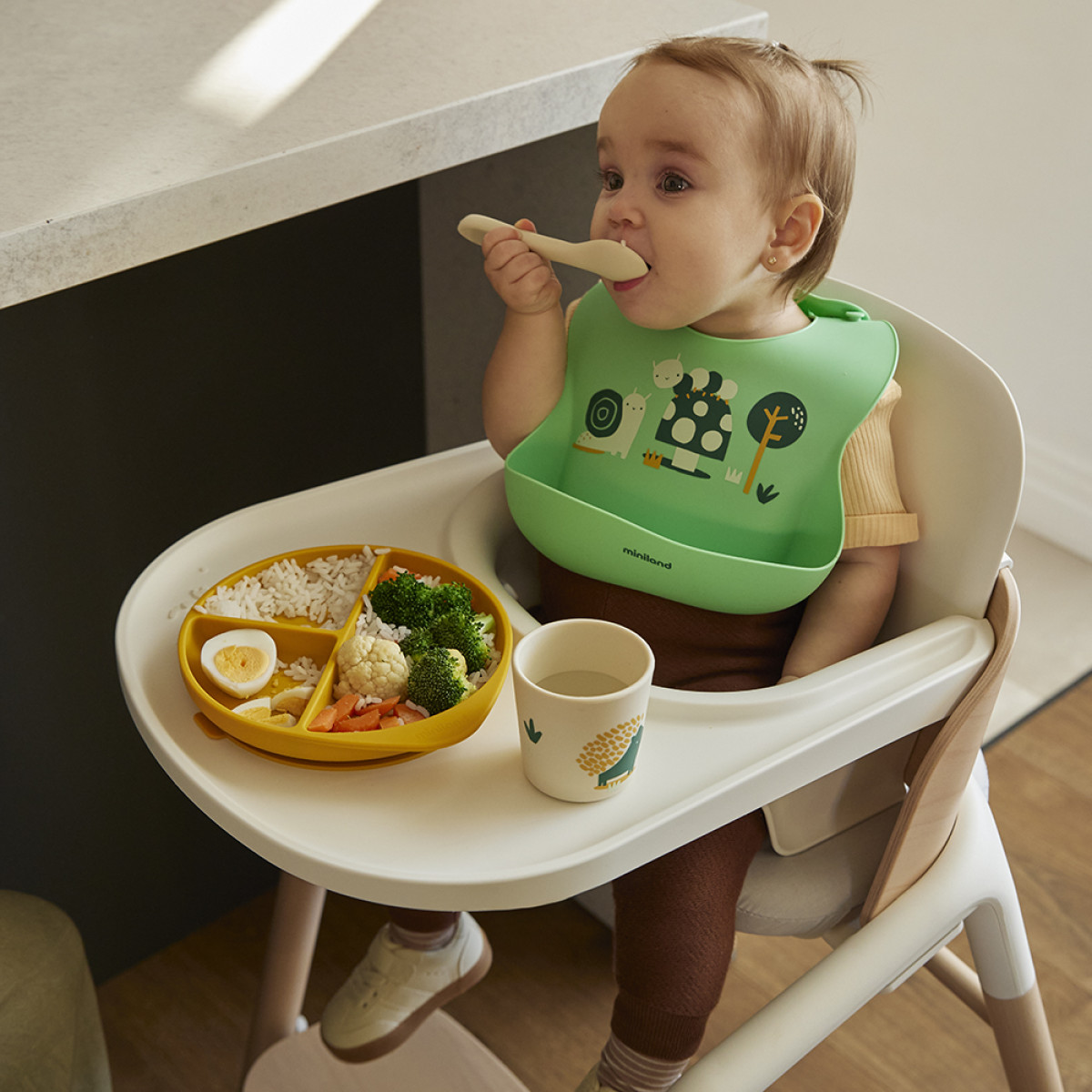 Το διαμερισματικό πιάτο του με ισχυρή βεντούζα αποτρέπει τις διαρροές, ενώ η ελαφριά, ευέλικτη και αναδιπλούμενη σαλιάρα με μεγάλη τσέπη για την συλλογή των ψίχουλων είναι ιδανική για να την πάρετε παντού.