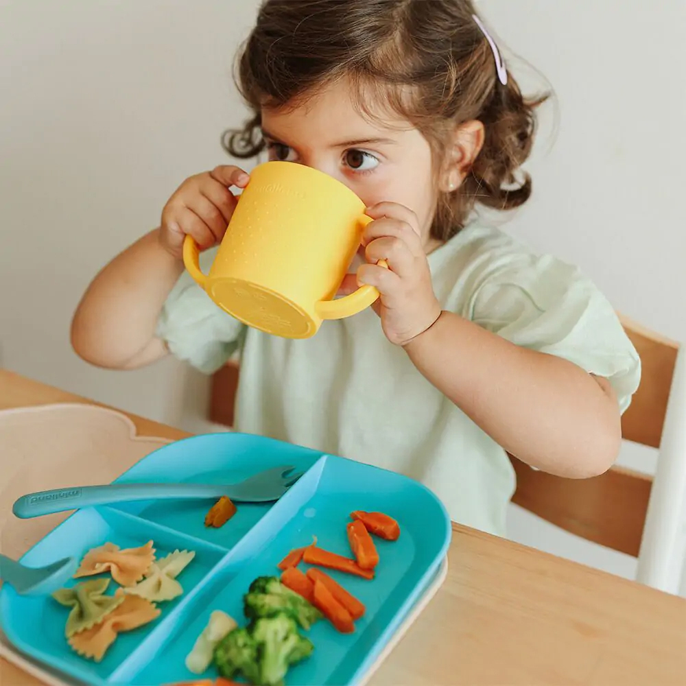 Περιλαμβάνει αντιολισθητικό σουπλά για την αποφυγή διαρροών, ένα πιάτο με τρεις θήκες ιδανικό για το διαχωρισμό διαφορετικών τύπων τροφών, σκεύη με στρογγυλεμένες άκρες για άνετη και ασφαλή χρήση και ένα εργονομικό ποτηράκι προσαρμοσμένο σε μικρά χέρια, ιδανικό για την ενθάρρυνση της ανεξαρτησίας.