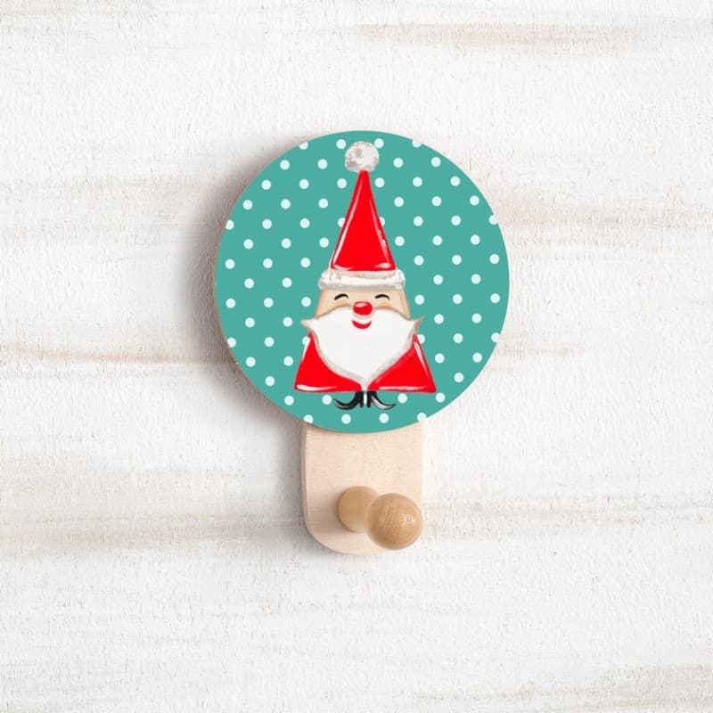 Ξύλινη natural κρεμάστρα τοίχου, διακοσμημένη με στρογγυλό κοπτικό print, πάνω στο οποίο απεικονίζεται ο Αγ. Βασίλης σε αποχρώσεις λευκές-κόκκινες πάνω σε βεραμάν φόντο.