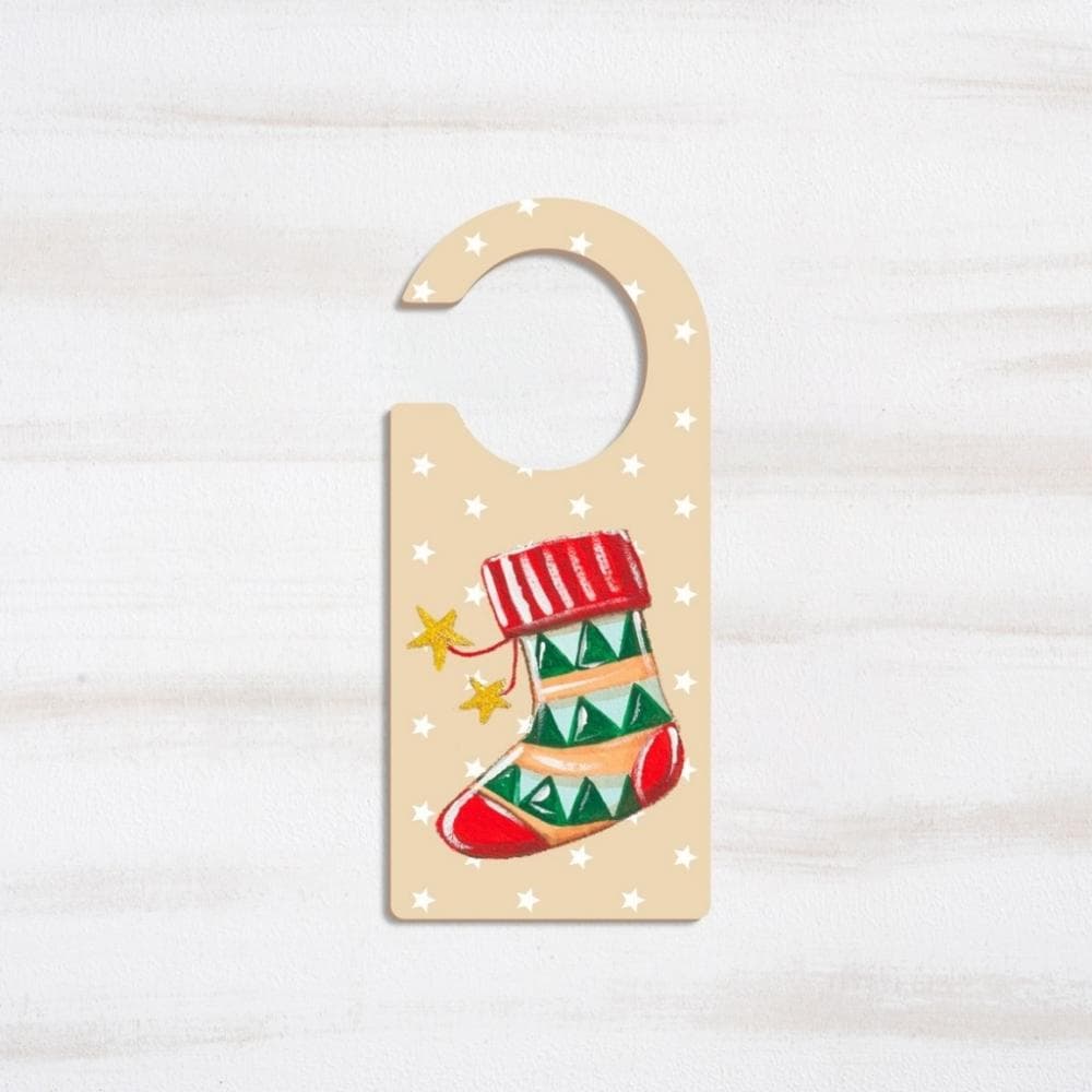 Ξύλινο διακοσμητικό πόρτας print, πάνω στο οποίο απεικονίζεται η χριστουγεννιάτικη κάλτσα σε αποχρώσεις κόκκινες-πράσινες, πάνω σε φόντο εκρού με αστεράκια λευκά.