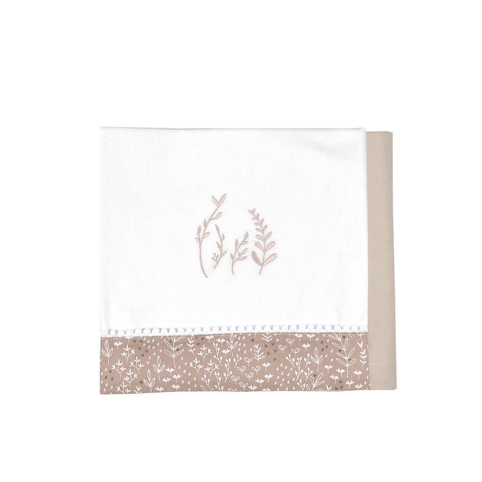 - Ένα κεντημένο πανωσέντονο που έχει λεπτομέρειες από φύλλα ενώ το μονόχρωμο κατωσέντονο είναι με λάστιχο στις 4 γωνίες ώστε να εφαρμόζουν πανεύκολα στο στρώμα του λίκνου, διάστασης 45εκ χ 90εκ.