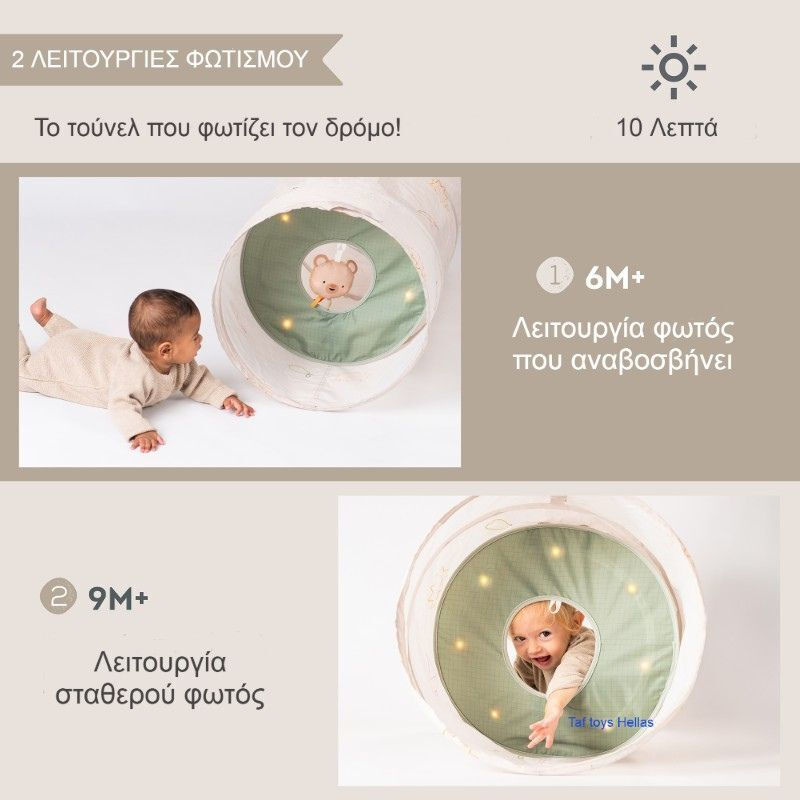 Τα φώτα που αναβοσβήνουν ενθαρρύνουν και αυξάνουν τον χρόνο που στέκεται στην κοιλίτσα του, ενώ μια συνεχής λάμψη παρακινεί τα μωρά να μπουσουλήσουν μέσα από το τούνελ ενθαρρύνοντας την εστίαση και την οπτική παρακολούθηση. Κάθε λειτουργία φωτός παίζει για 10 λεπτά, διασφαλίζοντας τη βέλτιστη ισορροπία μεταξύ εμπλοκής και χαλάρωσης.