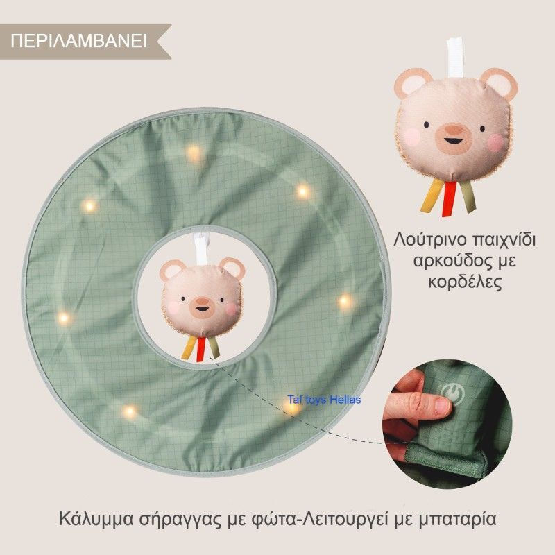 Το βελούδινο παιχνίδι αρκουδάκι, με τις κορδέλες και τον ήχο κουδουνίστρας, παρέχει ευκαιρίες για σύλληψη και ακουστική αναγνώριση, υποστηρίζοντας την αισθητηριακή ανάπτυξη.