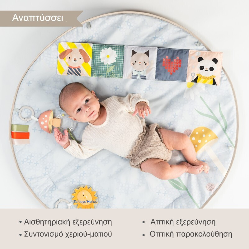Το παιδικό μας χαλάκι γυμναστικής και δραστηριότητας περιλαμβάνει 6 παιχνιδιάρικα παιχνίδια με πολλές αισθήσεις: βιβλίο διπλής όψης, μασητικό σε σχέδιο ήλιου, κουδουνίστρα μανιταριού με κορδέλες, παιχνίδια λουλουδιών, panda και αχλάδι που κρέμονται από το μουσικό. Αυτά τα παιχνίδια διεγείρουν την όραση, την ακοή, την αφή, τον γνωστικό και σωματικό συντονισμό του μωρού σας.