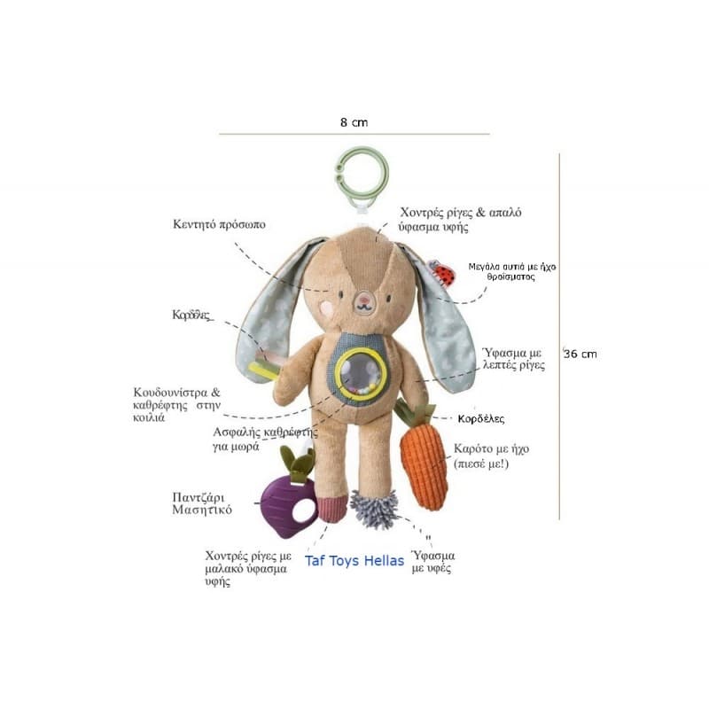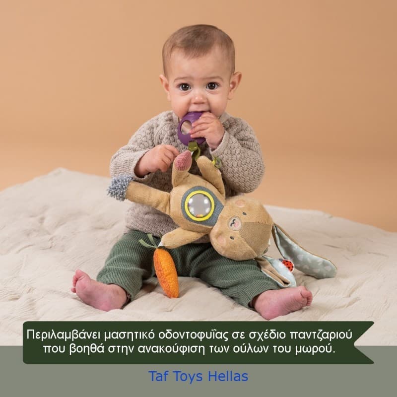 Το Taf Toys Jenny Activity Toy Bunny είναι ένα πολυλειτουργικό παιχνίδι δραστηριοτήτων που έχει σχεδιαστεί για να ψυχαγωγεί και να παρέχει διαφορετικές αισθητηριακές εμπειρίες στα μωρά για εξερεύνηση.