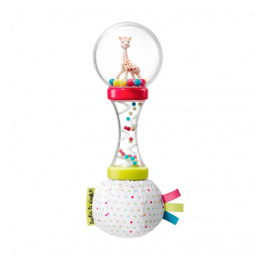 Μία ελαφριά διάφανη κουδουνίστρα σε μορφή μαράκας. Μικρές και μεσαίες μπαλίτσες ανεβοκατεβαίνουν γύρω από τη Σόφι καθώς το μωρό σας παίζει και κουνάει την αγαπημένη του κουδουνίστρα. Το μωρό σας παρακαλουθεί τη διαρκή κίνηση των χρωμάτων, καθώς περιστρέφει και κουνάει τη κουδουνίστρα του. Η άλλη πλευρά είναι μια μαλακή πάνινη crunchy μπαλίτσα, που όσο πατιέται τόσο ακούγεται σα να τσαλακώνεται και φυσικά το μωρό σας δε θα σταματήσει να πιπιλάει και να ανταποκρίνεται στους ήχους του παιχνιδιού του.