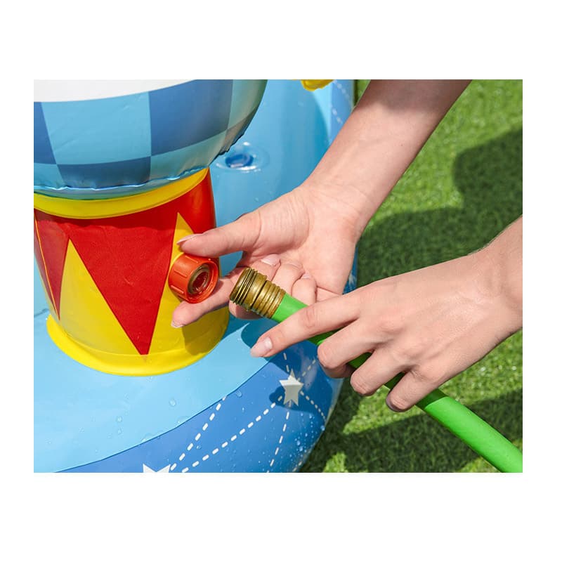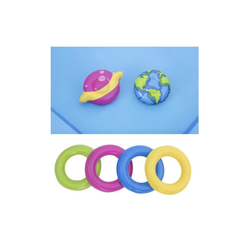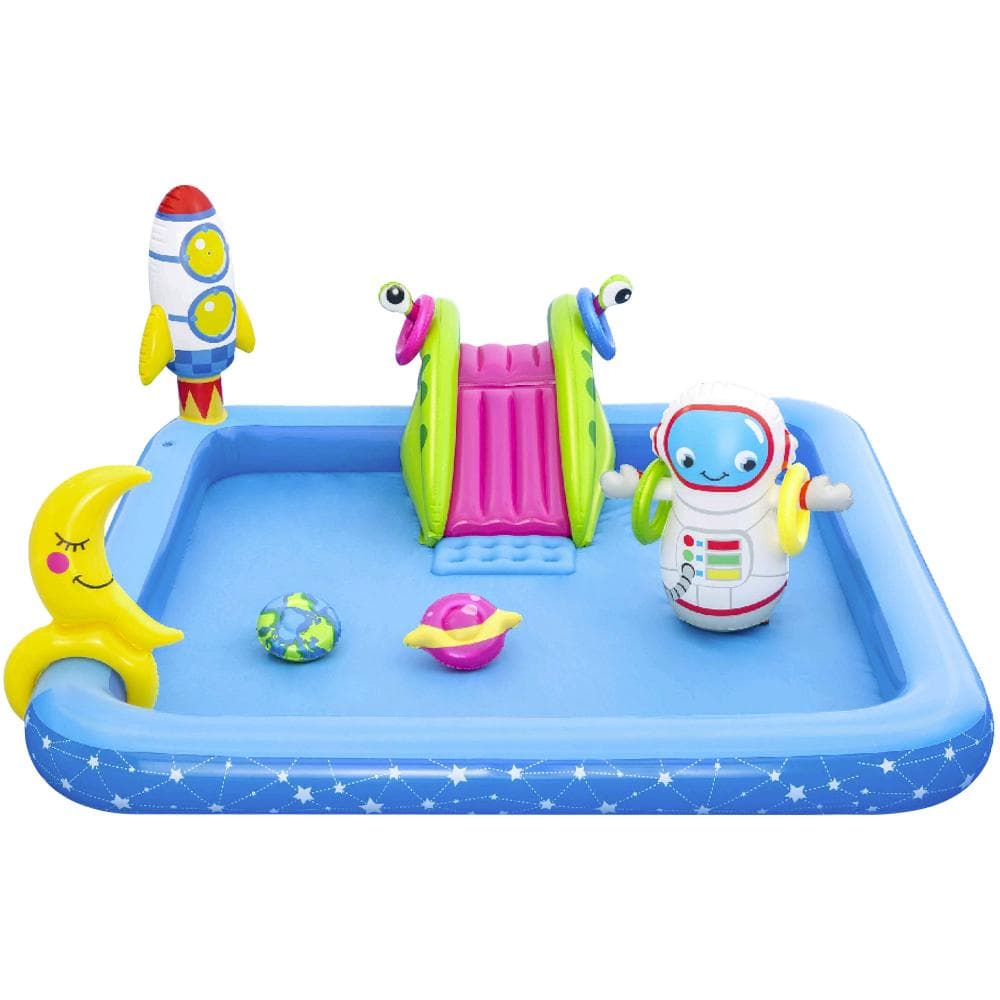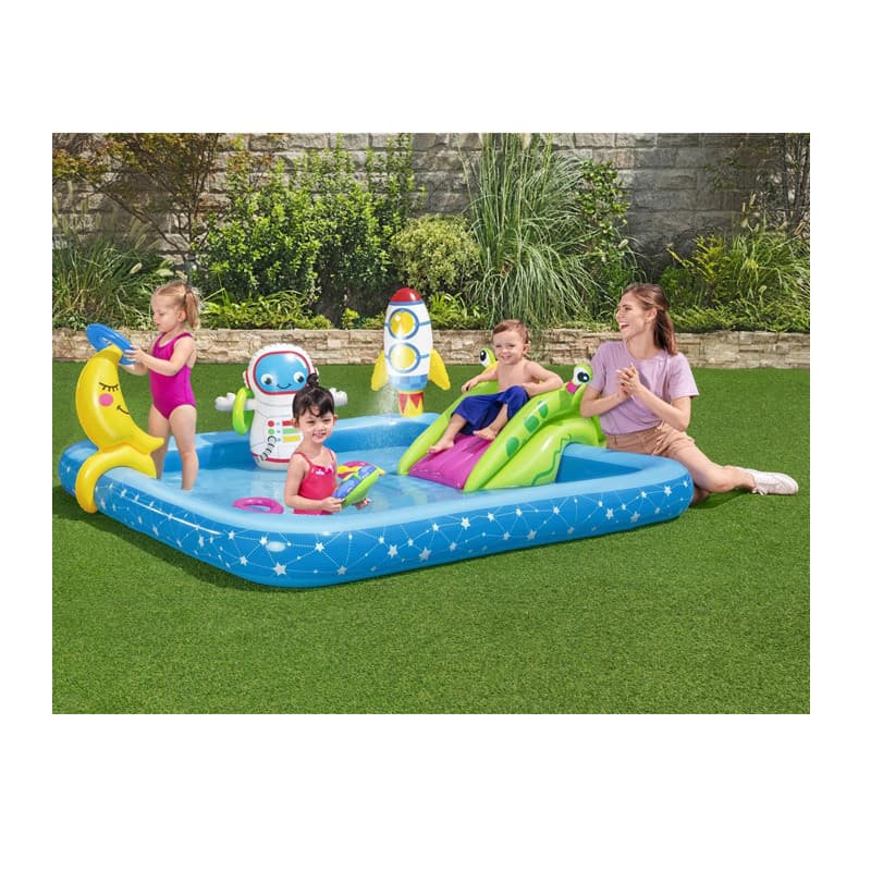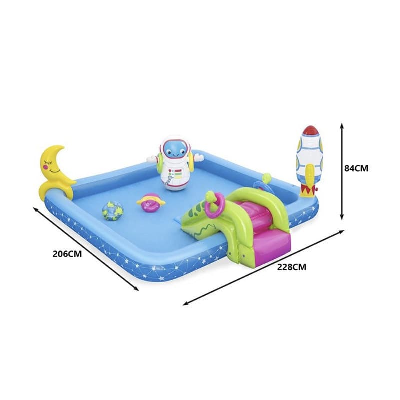 Η πισίνα περιλαμβάνει ένα πυραυλάκατο με ενσωματωμένο ψεκαστήρα ψύξης και μια διασκεδαστική τσουλήθρα συνδεδεμένη στην πισίνα με μαλακό μαξιλάρι προσγείωσης. Επιπλέον, περιλαμβάνονται πολλά διασκεδαστικά αξεσουάρ: ένας φουσκωτός σάκος του μποξ σε σχήμα ρομπότ για να χτυπήσει με τα 4 χρωματιστά δαχτυλίδια, 1 πλανήτη Γη Frisbee και 1 Κρόνο και ένα τρυφερό κίτρινο φεγγάρι, επίσης φουσκωτό.