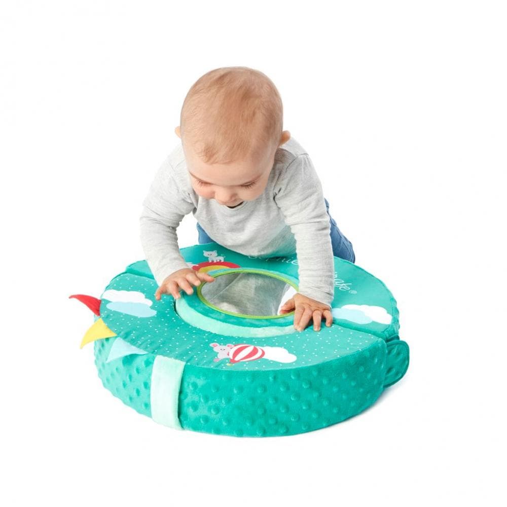 Από τους πρώτους μήνες το μωρό παίζει με τον κεντρικό κύκλο του τροχού που προσφέρει πολλές δραστηριότητες: ήχος τσαλακωμένου χαρτιού, κουδουνάκι, καθρέπτη...